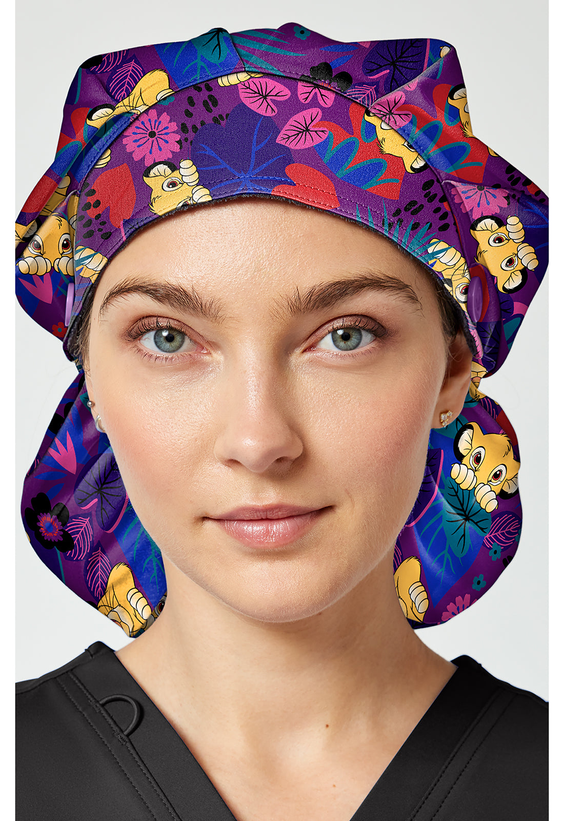This roomy print bouffant scrubs hat features buttons by ears to comfortably hold a protective face mask in place. (Mask sold separately.) Hat also includes front pleats with enough fullness for complete hair and ear coverage and terry cloth sweatband for comfort. Back elastic plus adjustable tie for a secure fit. Unisex fit.